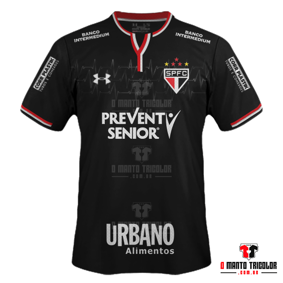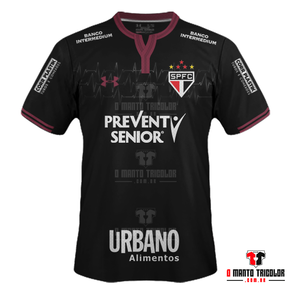 As informações que nossa equipe recebeu é de que a camisa será preta, com o mesmo modelo de gola da camisa branca, e com os batimentos cardíacos. Existe também a informações que terá detalhes “bordô”.